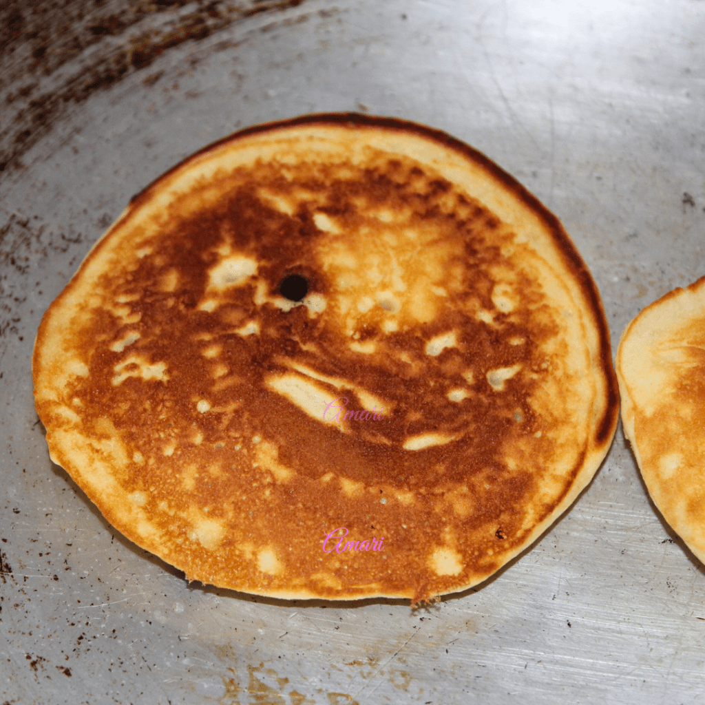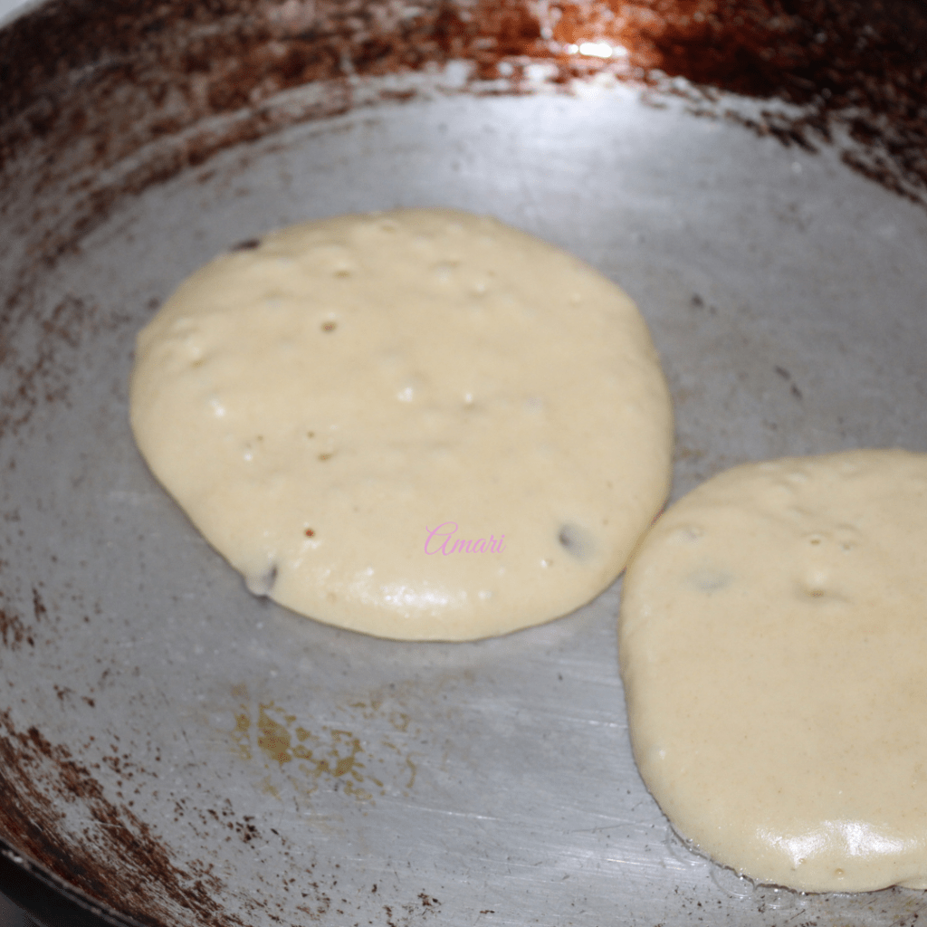 • 6.) Pour about 2 to 3 spoonfuls of batter using a large spoon or ice-cream scoop onto the pan, make sure to keep space between them. Spread just a bit with the back of a spoon – though make sure it’s a thick height e.g. 1/4 or half an inch. Cook the pancakes for about 1 – 2 minute; until bubbles appear on the surface.