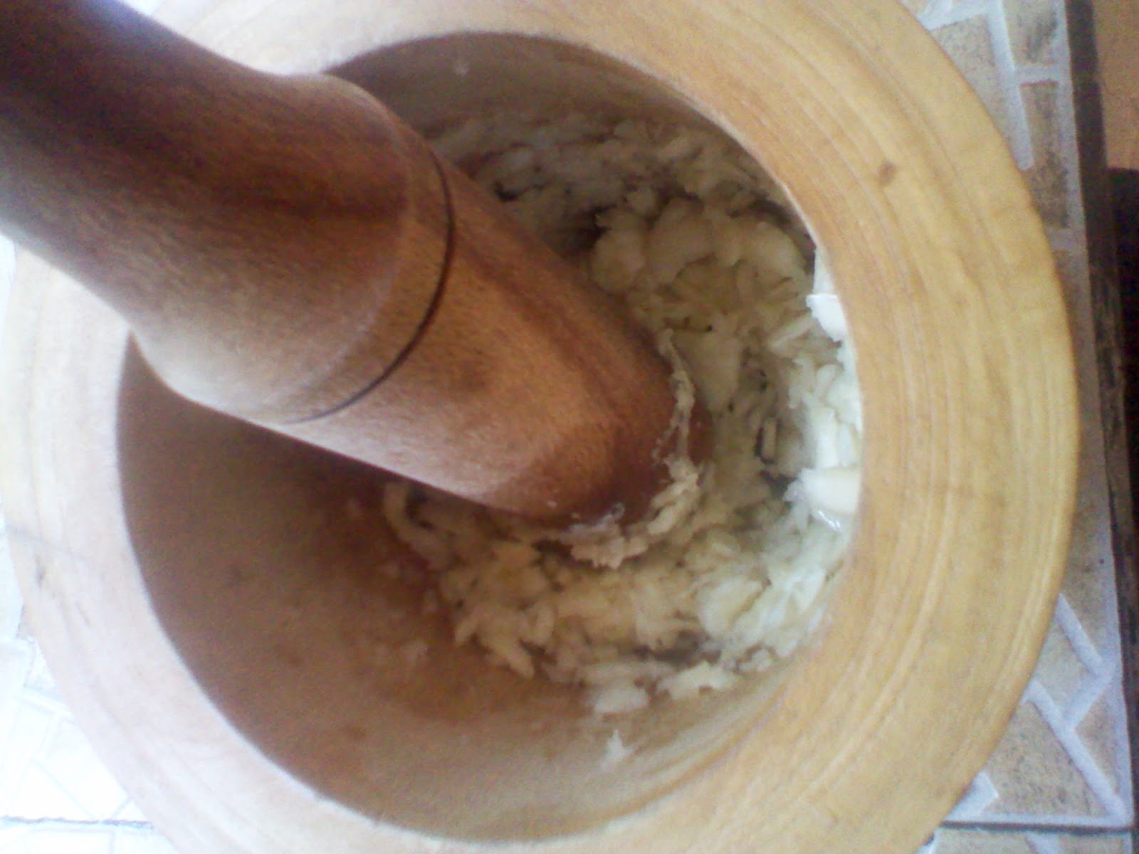 cut garlic into pieces and put them into a mortar and pestle. Crush them for about 2 – 3 minutes.