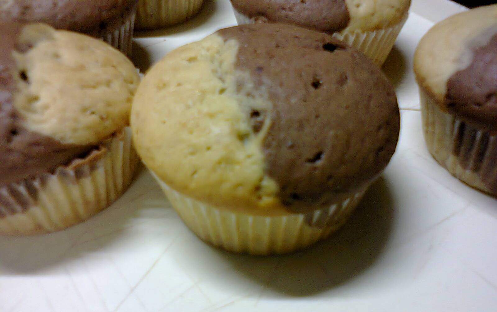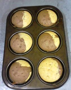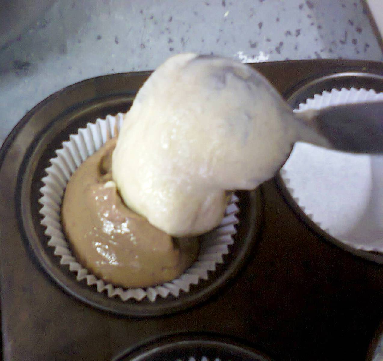 7. Spoon the batters into the pans or cup liners and fill approximately 2/3 each. Spoon each batter on one side of the liner equally.