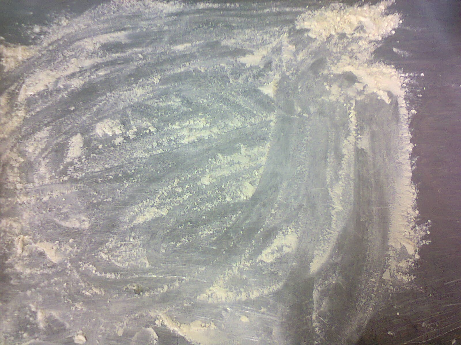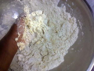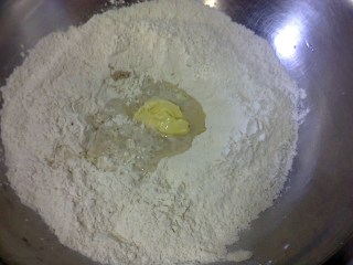 - Put in the margarine into the flour mixture and mix it with your hands, you can also use a pastry cutter to cut the fat into the flour. Then make a small hole in the middle of your flour mixture in the bowl.