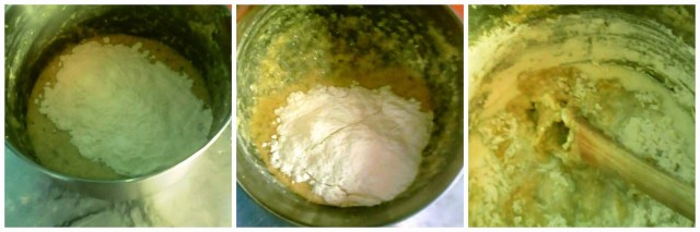 7. Using a spatula or wooden spoon, fold in half the flour into your wet mixture until well incorporated. Add an 1/8 cup of the squeezed lemon juice, then add the rest of the flour, folding gradually with milk until it’s the correct ‘drop’ consistency.