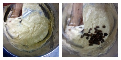7. Drain the dried fruits off all the water and pour them into the batter. Fold in gently until well mixed. (Ensure you pat the fruits dry well – using a kitchen towel, if you don’t they’ll sink to the bottom. You can also dust the fruits with a bit of flour after patting them dry as well.)
