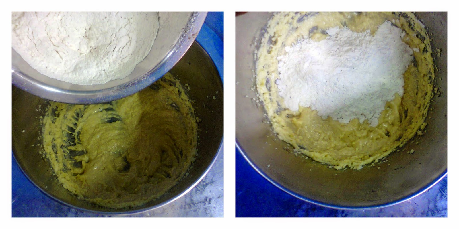 6. Add vanilla into mix and beat for about half a minute. Then add half the dry ingredients into the large bowl and fold with a spatula until well mixed. Add the final dry ingredients while mixing with milk gradually until the right drop texture.