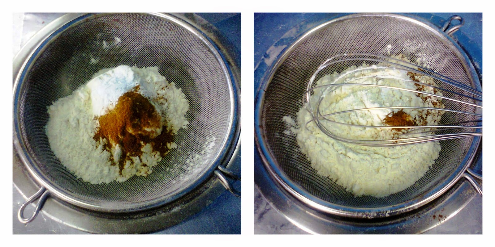 3. Measure your dry ingredients (flour, baking powder & cinnamon) in a medium bowl and sift them.