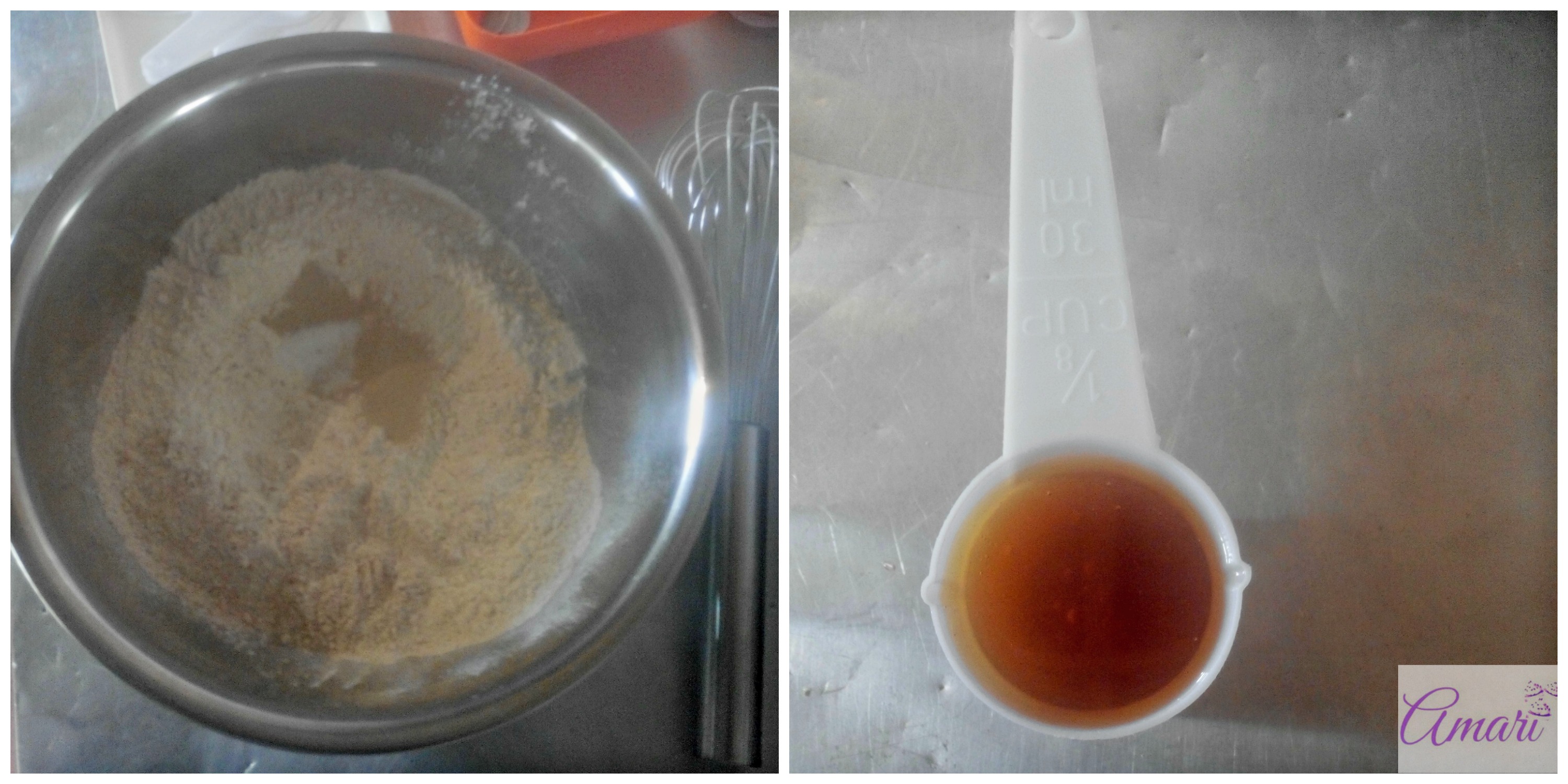 - Start by measuring your dry ingredients into a large bowl (flours, yeast & salt) and combine them. Then measure the vegetable oil, honey, vanilla bean paste & beaten egg and add them into the dry ingredients.