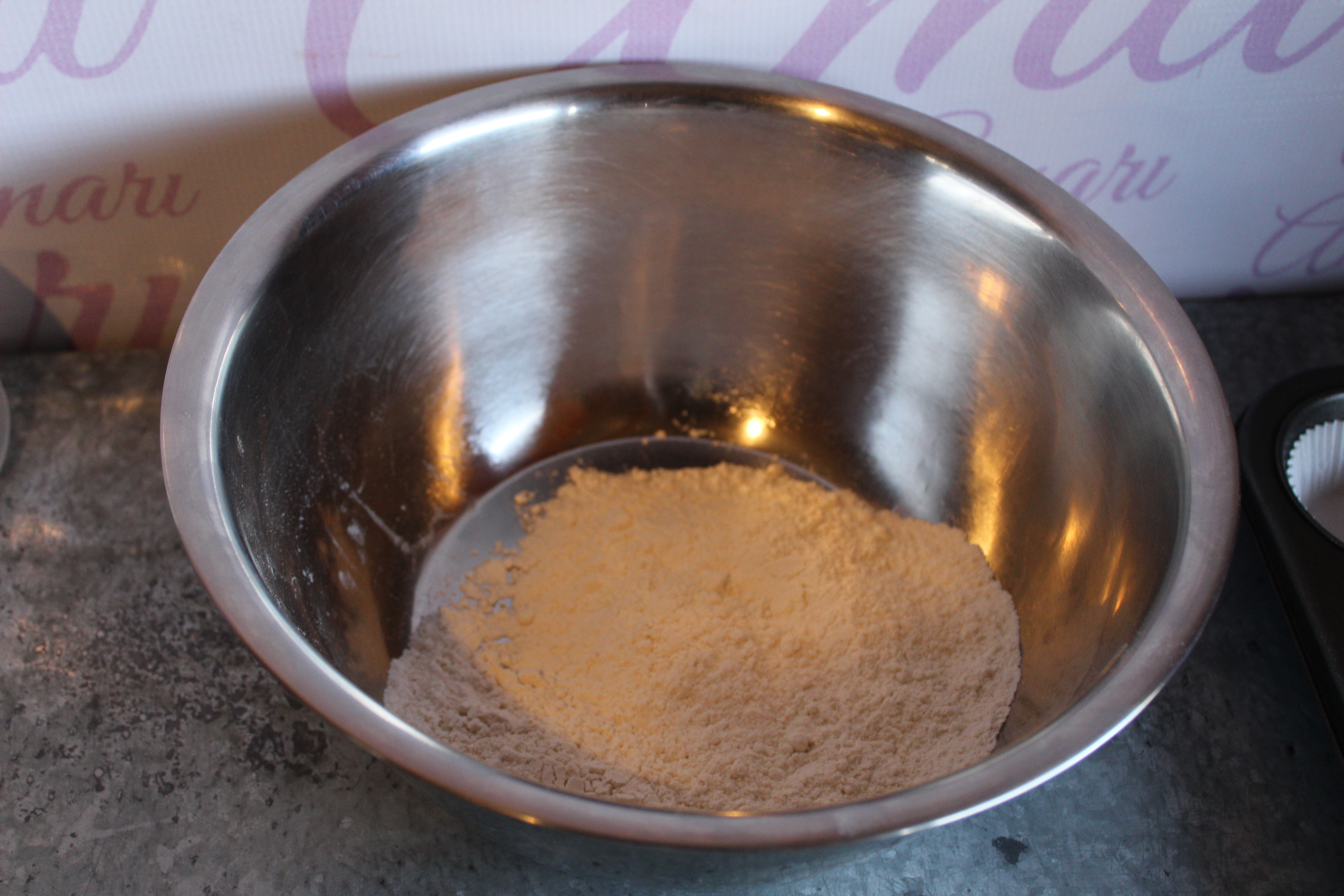 - Pre-heat oven to 180 ºC or 350 °F. Line a regular sized muffin pan with cupcake liners and set aside.