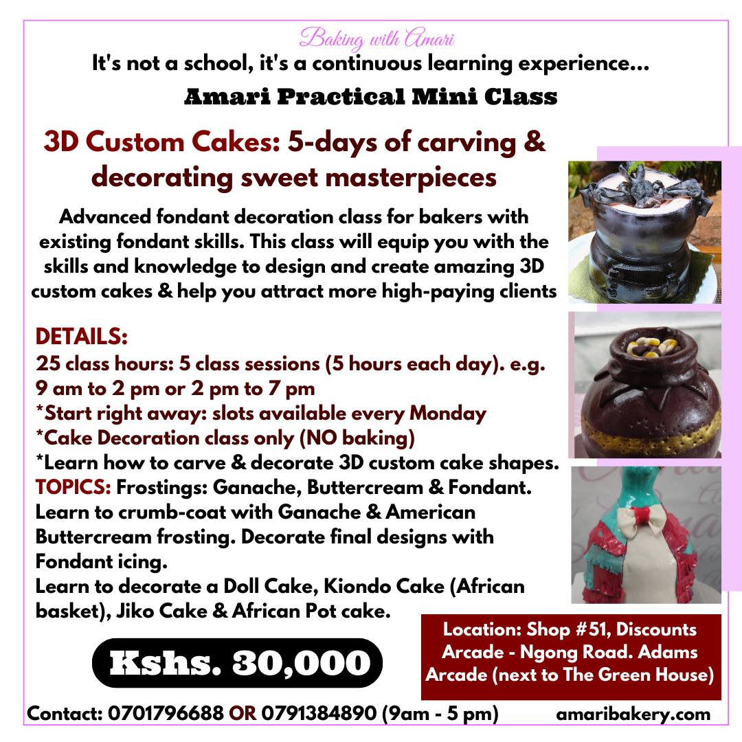 Previous Image Next Image 3D Custom cakes_Advanced fondant deco class-Baking with Amari Poster 2023 Share this: Share on Facebook (Opens in new window) Facebook Share on Pinterest (Opens in new window) Pinterest Share on WhatsApp (Opens in new window) WhatsApp Share on Telegram (Opens in new window) Telegram Share on X (Opens in new window) X Share on LinkedIn (Opens in new window) LinkedIn Like Loading...