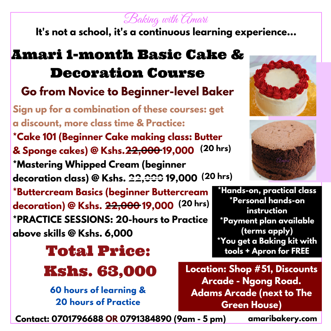 Previous Image Next Image Amari One month Basic Cake and Deco course_Baking with Amari poster 2023 Share this: Share on Facebook (Opens in new window) Facebook Share on Pinterest (Opens in new window) Pinterest Share on WhatsApp (Opens in new window) WhatsApp Share on Telegram (Opens in new window) Telegram Share on X (Opens in new window) X Share on LinkedIn (Opens in new window) LinkedIn Like Loading...