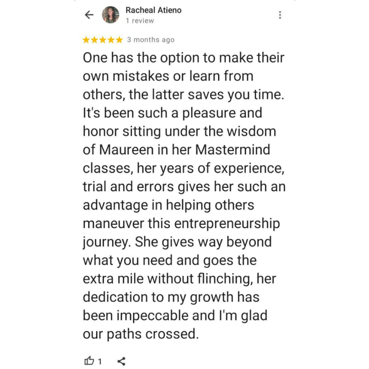 Starting Rate – Online one-on-one Coaching: Kshs. 40,000 for 3 months of weekly 2 to 3 hour Online video sessions and Monthly Business Planning & Review Sessions.