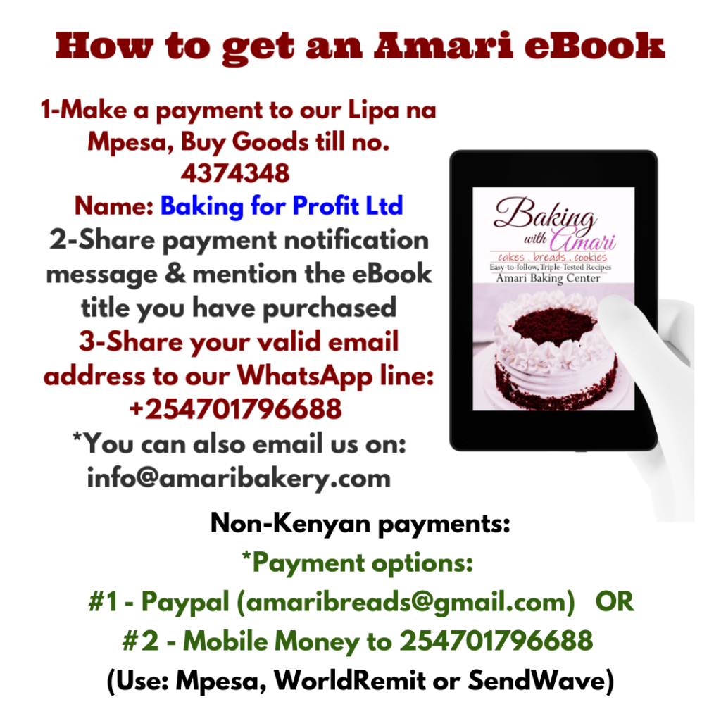 To get the E-book; send payment to Mpesa Lipa na Mpesa, Paybill Business number 400200. Account no. 18538, Business name: Baking for Profit Ltd. Then text email address and details to Mobile no. 0701796688