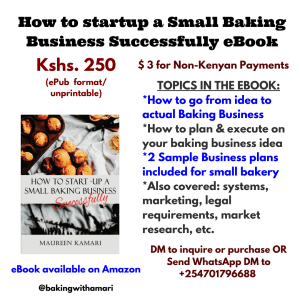 Kenyan payments: To get it sent on your e-mail; send the payment of Kshs. 250 via our MPESA Buy Goods Till no. 4374348(Baking for Profit ltd). The E-book will be emailed to you after confirmation of your payment (send a text to no. 0701796688 with payment confirmation text). Please note that it’s un-printable.