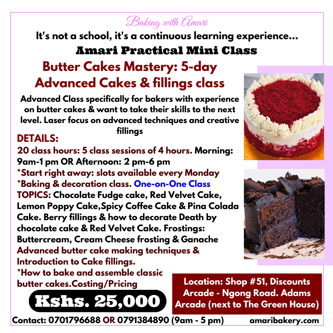 Previous Image Next Image Butter cakes Mastery_Advanced baking and decoration class_Baking with Amari poster 2023 Share this: Share on Facebook (Opens in new window) Facebook Share on Pinterest (Opens in new window) Pinterest Share on WhatsApp (Opens in new window) WhatsApp Share on Telegram (Opens in new window) Telegram Share on X (Opens in new window) X Share on LinkedIn (Opens in new window) LinkedIn Like Loading...