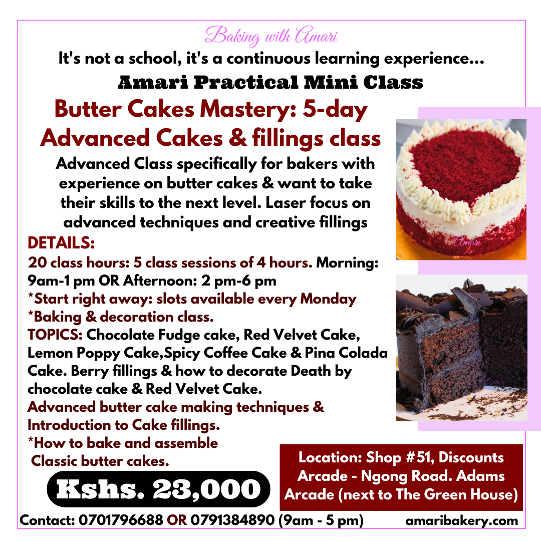 Previous Image Next Image Butter cakes Mastery_Advanced baking and decoration class_Baking with Amari poster 2023 Share this: Share on Facebook (Opens in new window) Facebook Share on Pinterest (Opens in new window) Pinterest Share on WhatsApp (Opens in new window) WhatsApp Share on Telegram (Opens in new window) Telegram Share on X (Opens in new window) X Share on LinkedIn (Opens in new window) LinkedIn Like Loading...