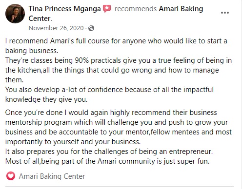 Previous Image Next Image Tina FB Review for Amari Baking Center classes Share this: Share on Facebook (Opens in new window) Facebook Share on Pinterest (Opens in new window) Pinterest Share on WhatsApp (Opens in new window) WhatsApp Share on Telegram (Opens in new window) Telegram Share on X (Opens in new window) X Share on LinkedIn (Opens in new window) LinkedIn Like Loading...